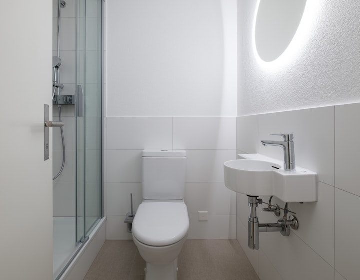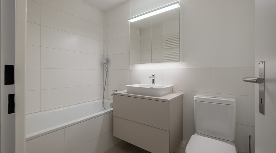 - Komplett erneuerte Nasszellen mit hellen Platten: Dusche mit Toilette und Waschturm sowie Bad mit Lavabo und Unterbauschrank, Spiegelschrank und Toilette